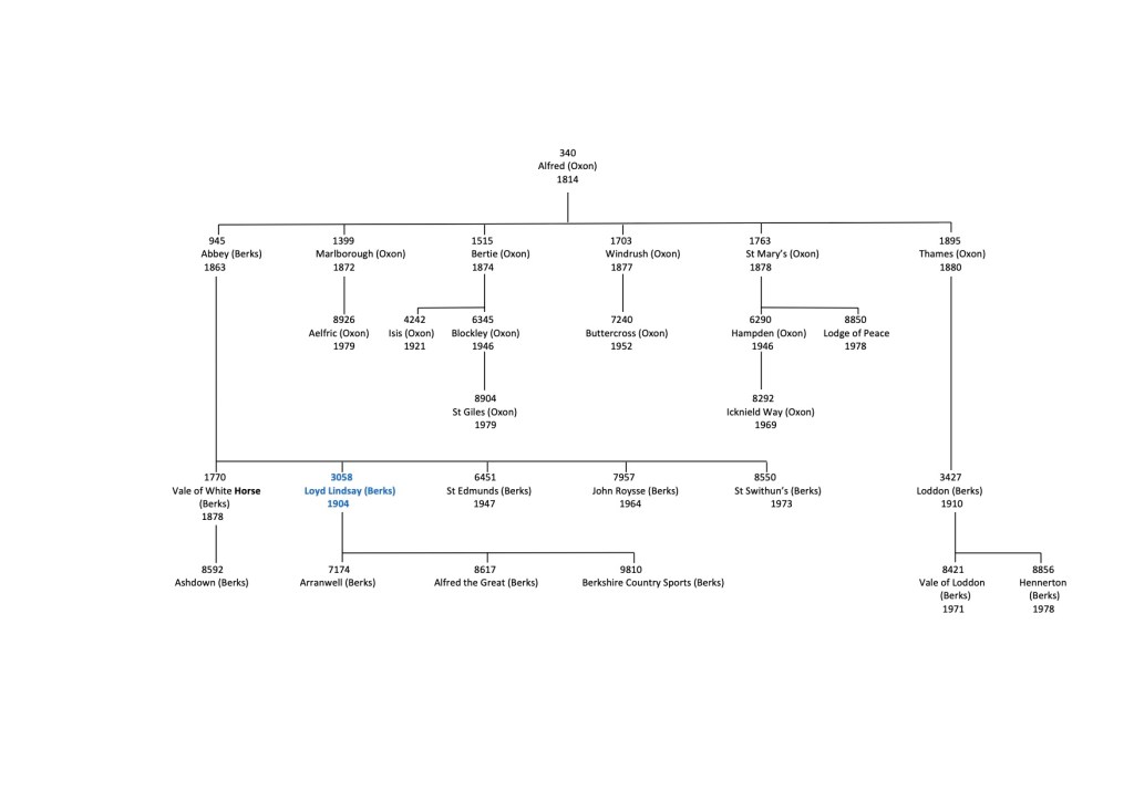 As you can see from our Family Tree, we have strong connections with both the Province of Berkshire and the Province of Oxfordshire. The Loyd Lindsay Lodge originates from the Abbey Lodge No. 945 (Berkshire), consecrated in 1863 and they, in turn were formed from the Alfred Lodge No. 340 (Oxfordshire), which was consecrated in 1814. It is one of those remarkable Masonic coincidences, which often seem to happen, that the Alfred the Great Lodge, consecrated 1974, and one of our daughter lodges, should bear the same name as the Lodge we originated from.